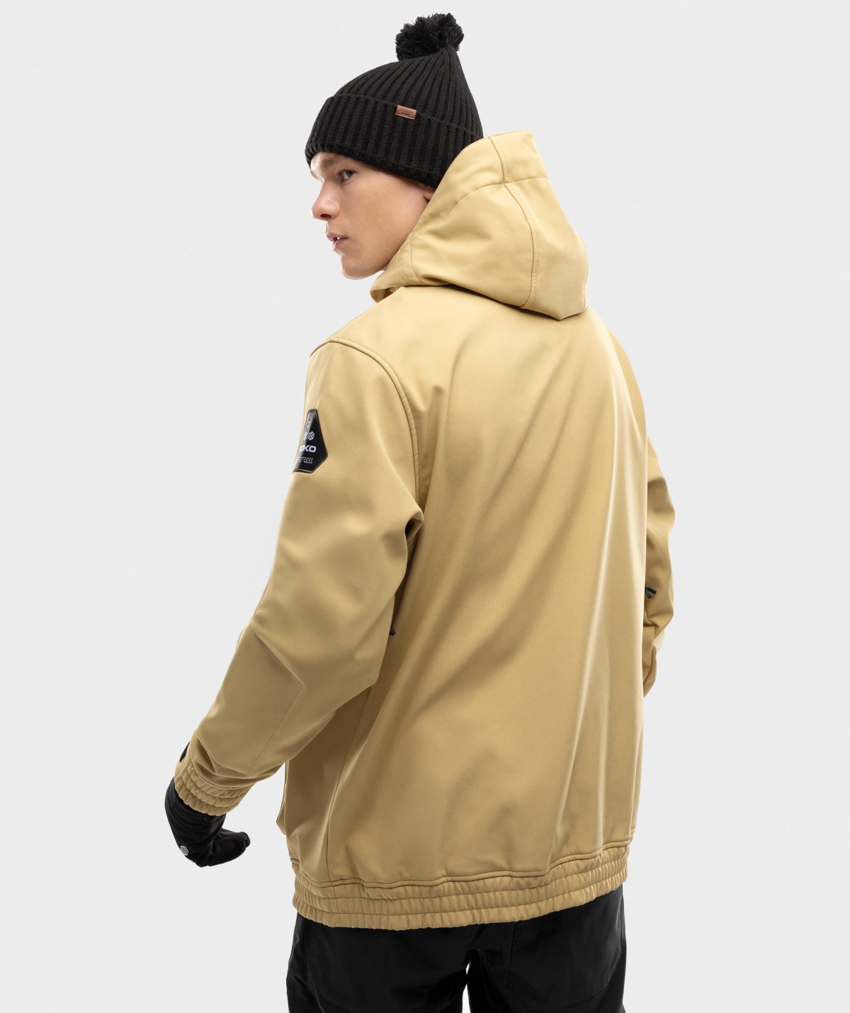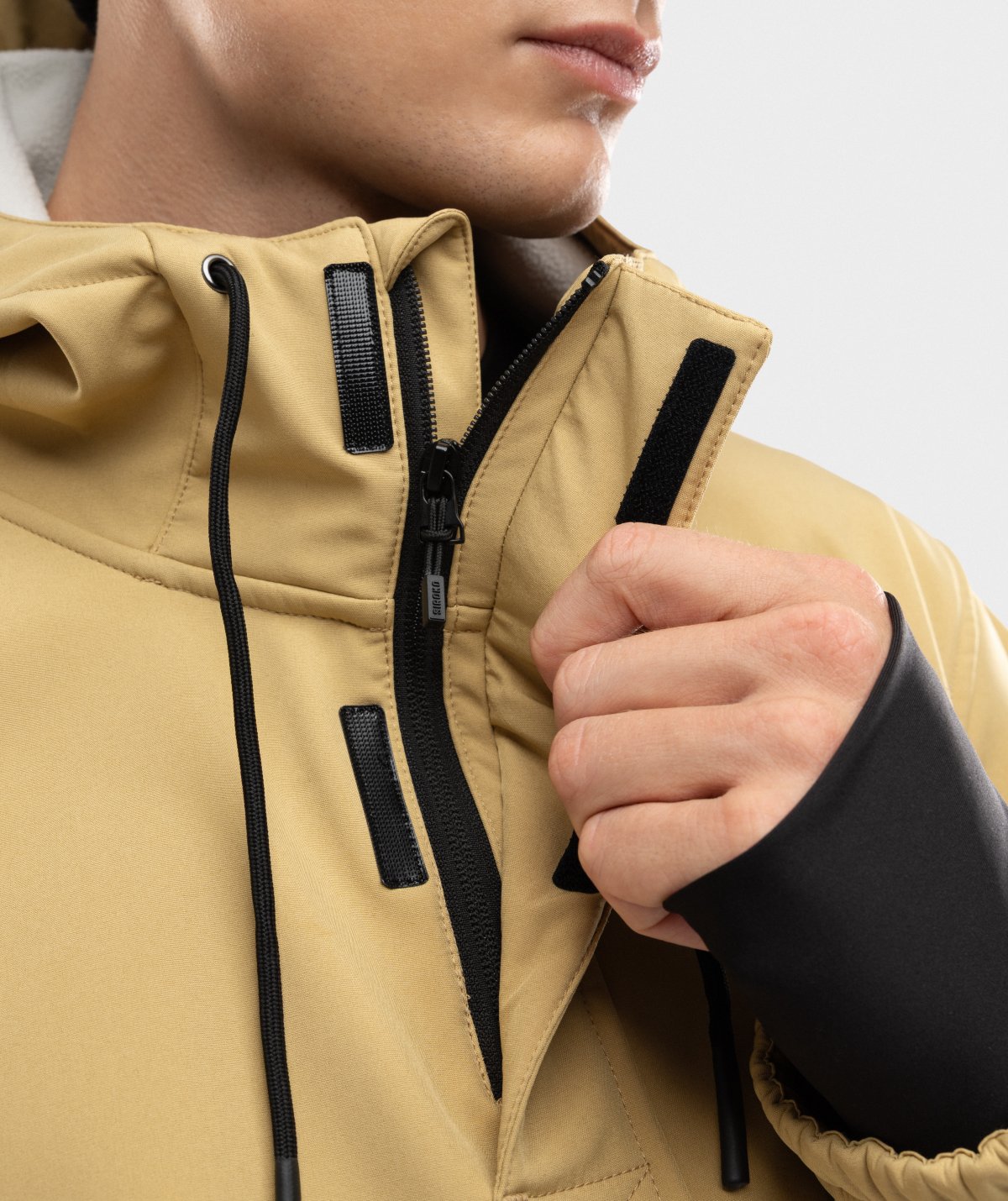 Softshellstoffet er sammensat af tre lag af forskellige materialer for at sikre en optimal ydeevne. Det yderste lag er fremstillet af polyester og elastan og beskytter mod sne og regn (vandsøjletryk op til 10.000 mm). Det mellemste lag er lavet af en TPU-membran, der beskytter dig mod vinden og transporterer fugt væk fra din krop. Det inderste lag giver fremragende varmeisolering takket være mikro-fleece stoffet i polyester, der hjælper med at holde på kropsvarmen.