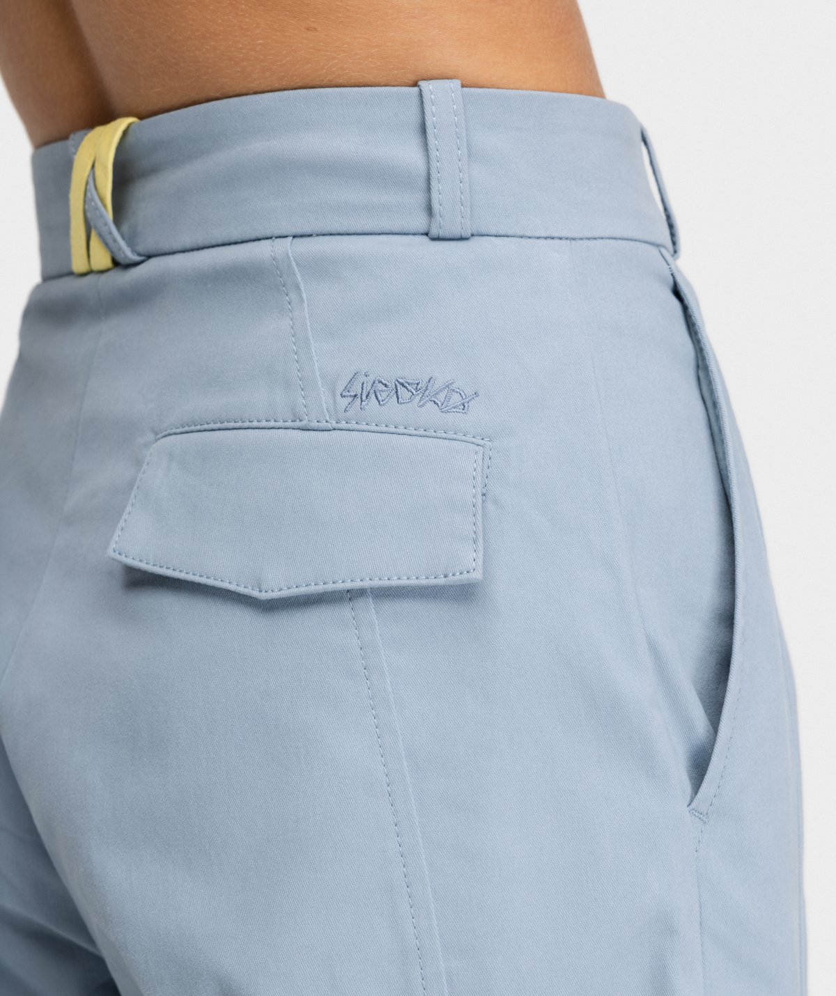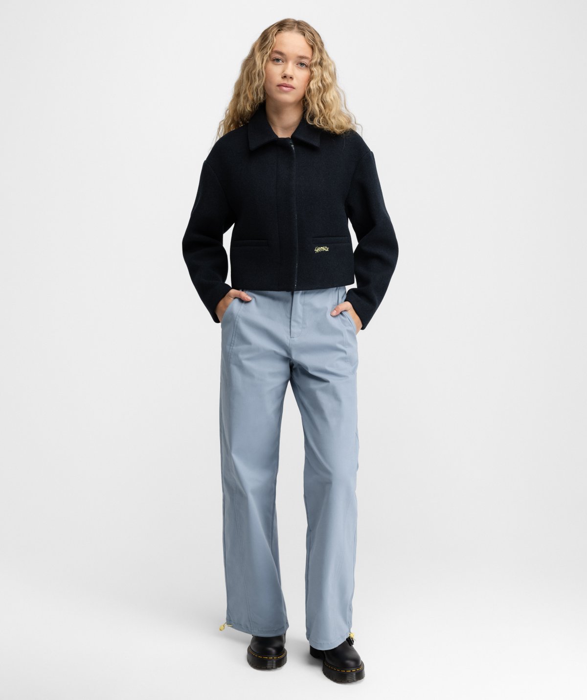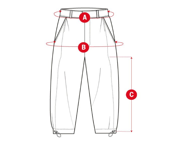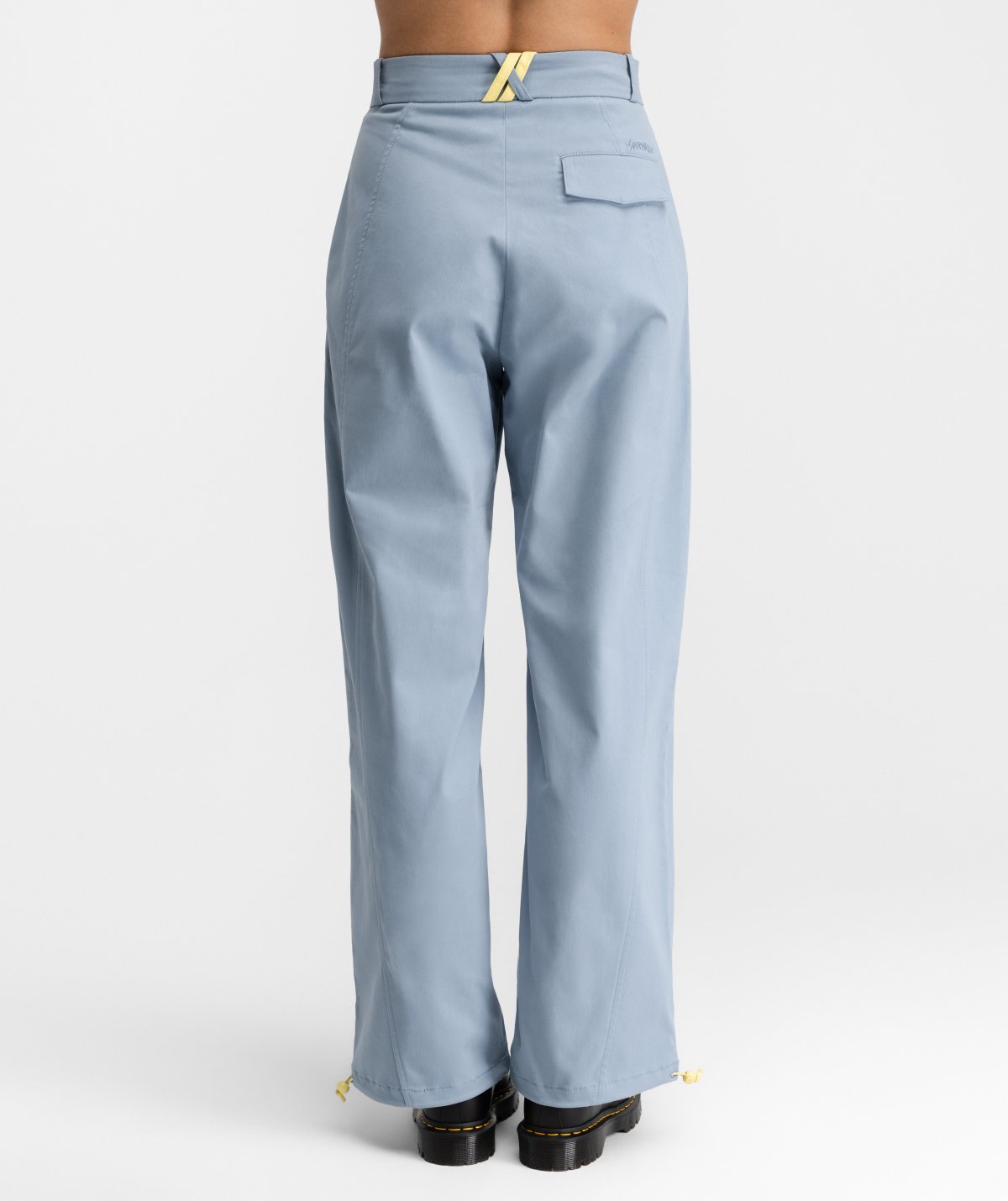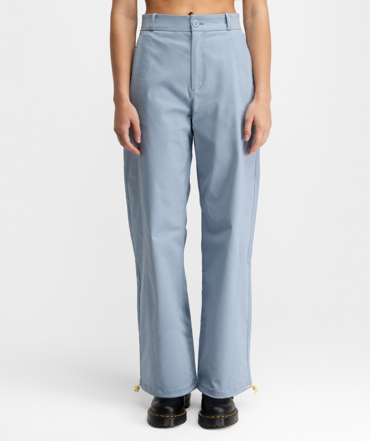 - Korkea vyötärö, suorat lahkeet ja kiristysnauhoilla säädettävät lahkeensuut