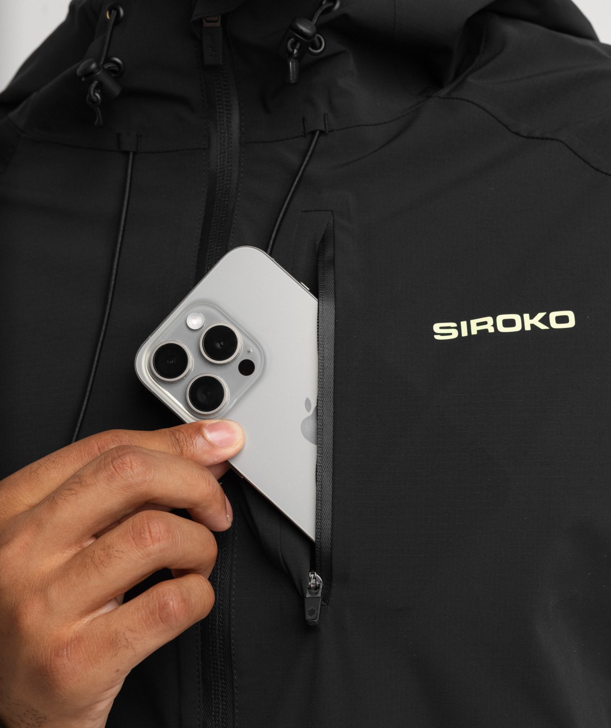 - Kolme vedenpitävää vetoketjullista taskua: kaksi sivuilla ja yksi rinnassa