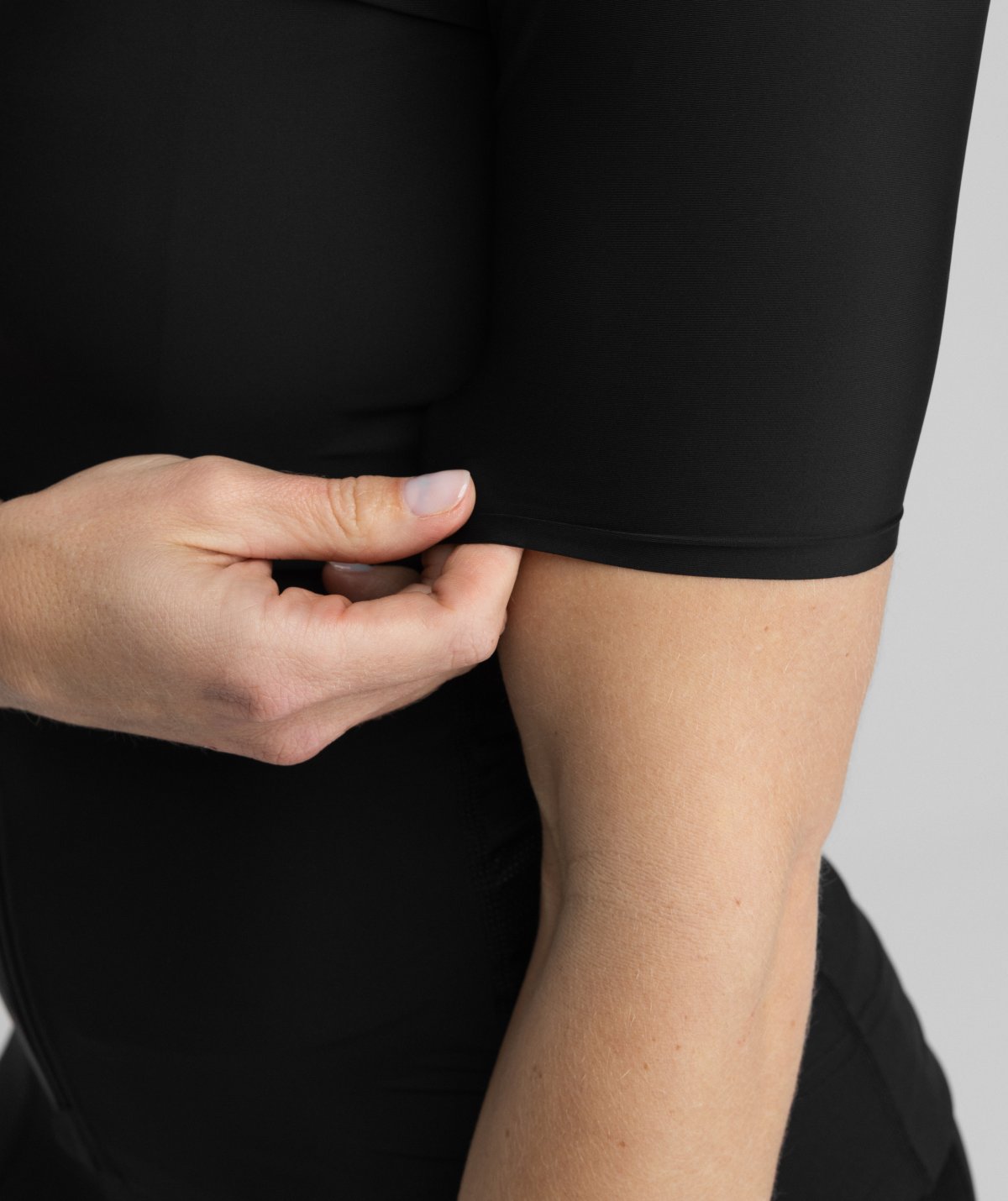 Se trata de un maillot de tejido extra-elástico de gama alta (nylon + elastano) con un ajuste Racefit perfecto gracias a sus mangas de tejido de alta compresión, corte láser Seamless y al sistema de fijación interna Xtra-Gripper. La última tecnología Breathlock+ aporta una transpiración perfecta que, junto a los materiales más ligeros de secado rápido, logran una comodidad jamás vista.