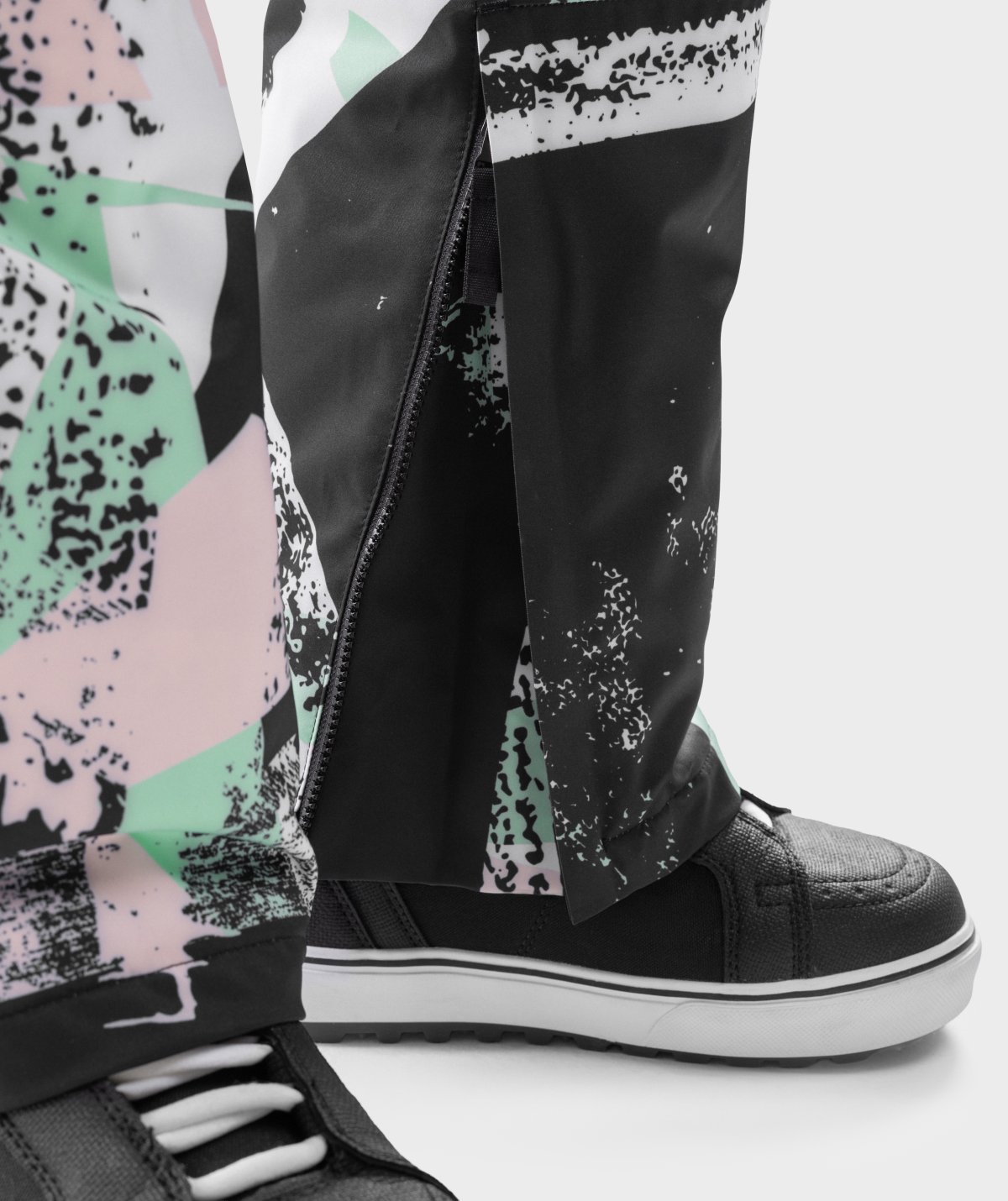En blanding av polyester, polyamid og elastan pluss forseglede sømmer gir beskyttelsen du trenger mot vind, snø og regn (10 000 mm vannsøyle). Vanntette snøgamasjer og ankelglidelåser med kile gir forbedret støvelpassform og ekstra snøbeskyttelse. Nettingfôrede glidelåsventiler på innsiden av låret hjelper til med å transportere bort kroppsfuktighet (pusteevne 10 000 g/m²/dag).
