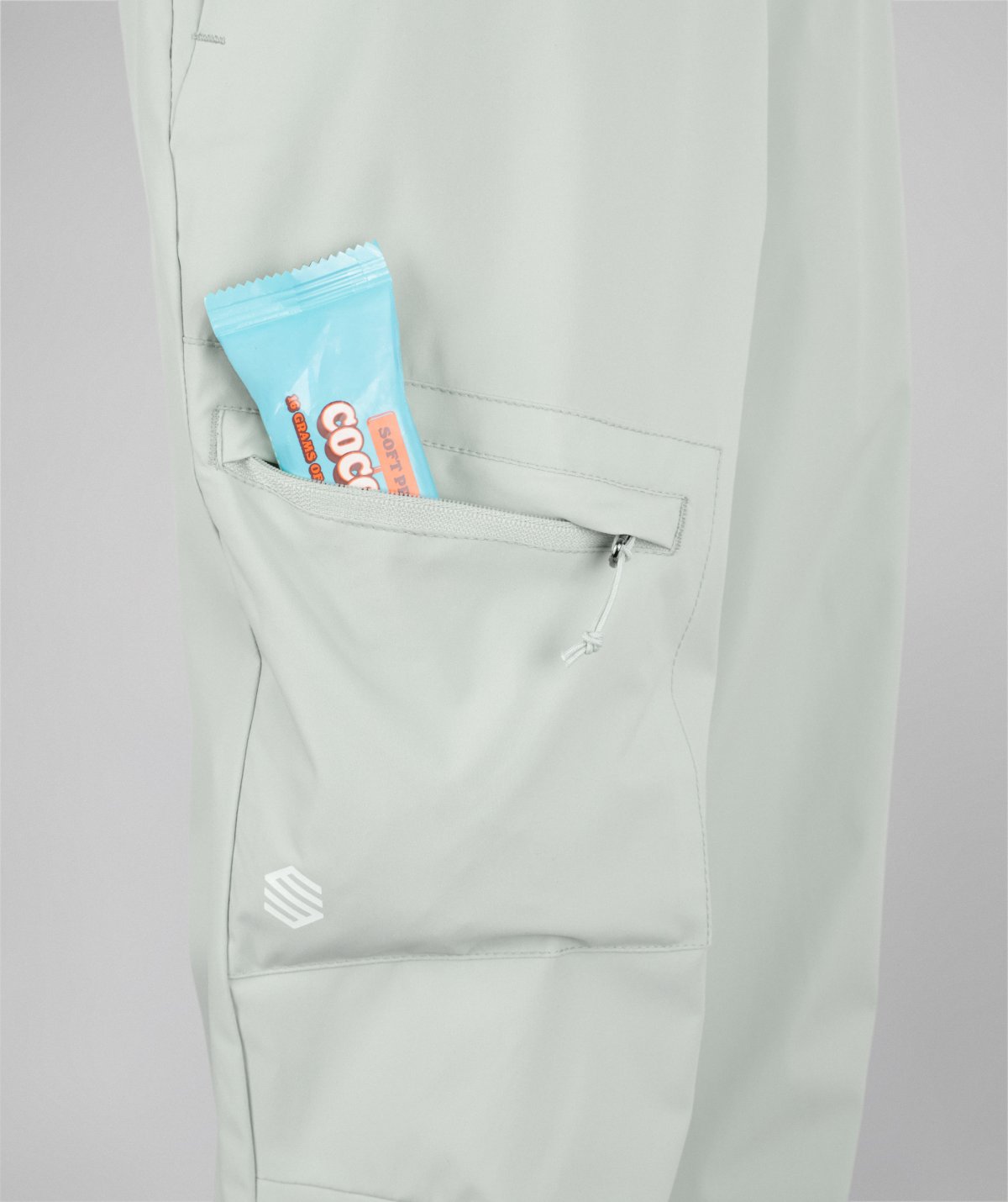 - Two zippered side pockets with elastic mesh lining plus one extra zippered pocket on the right thigh