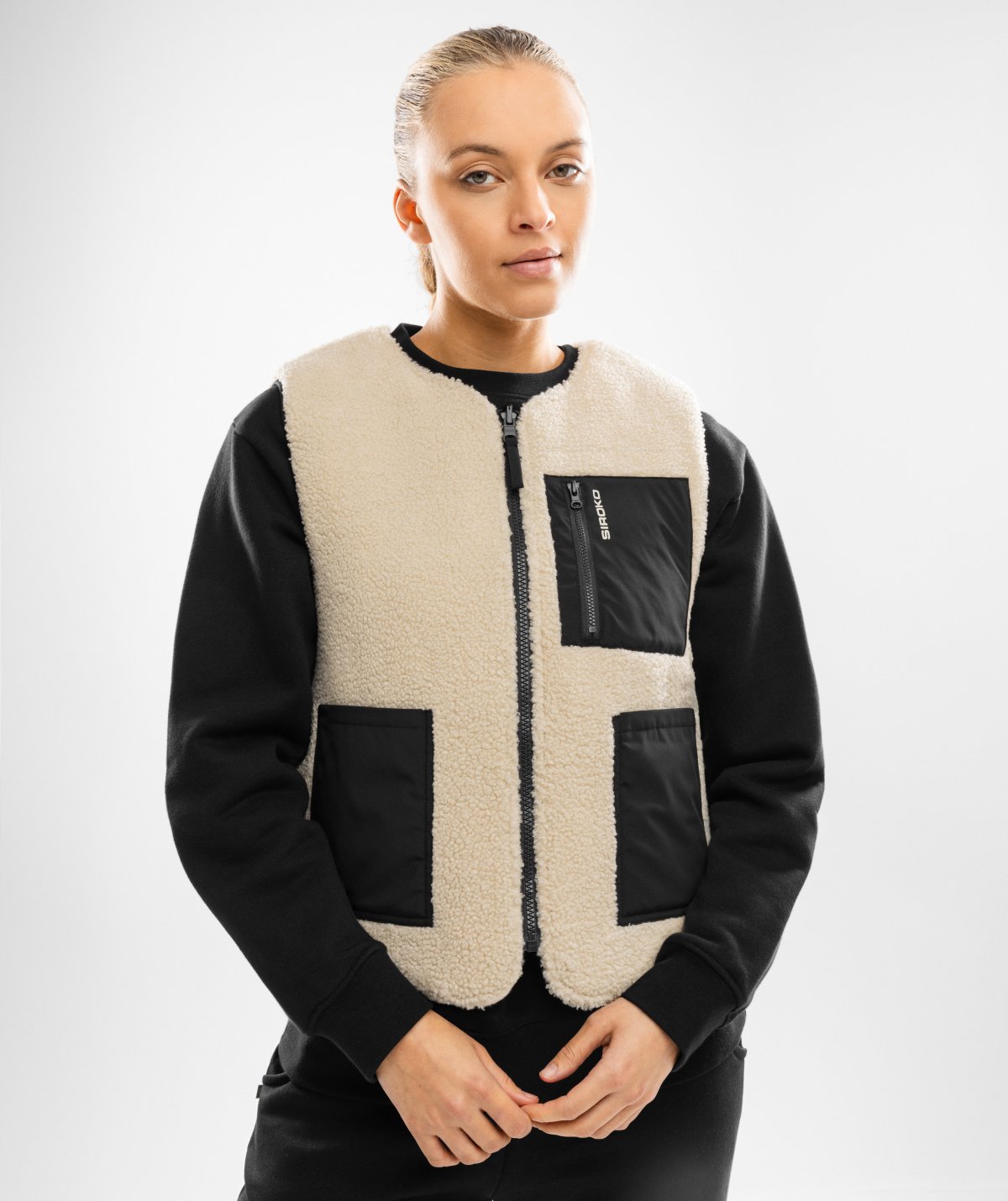- Two front pockets and one zippered chest pocket on side B