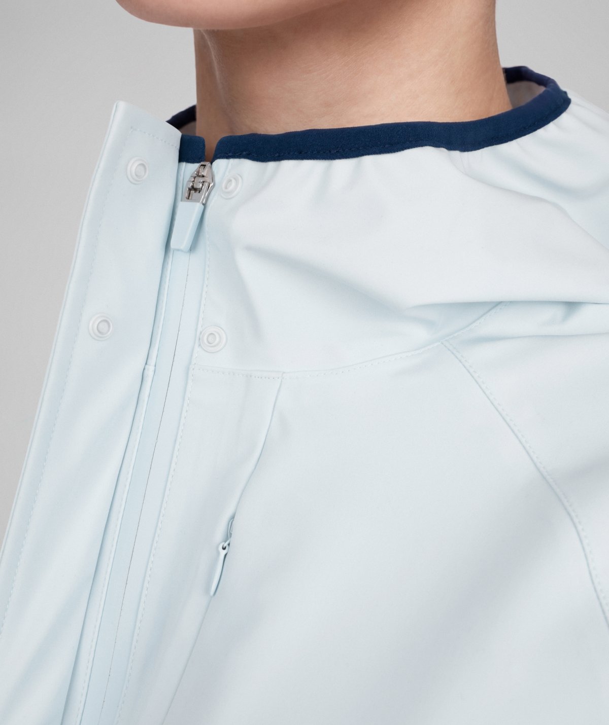 - Krótki suwak pod szyją podszyty warstwą materiału zapobiegającą otarciom i górna osłonka chroniąca podbródek