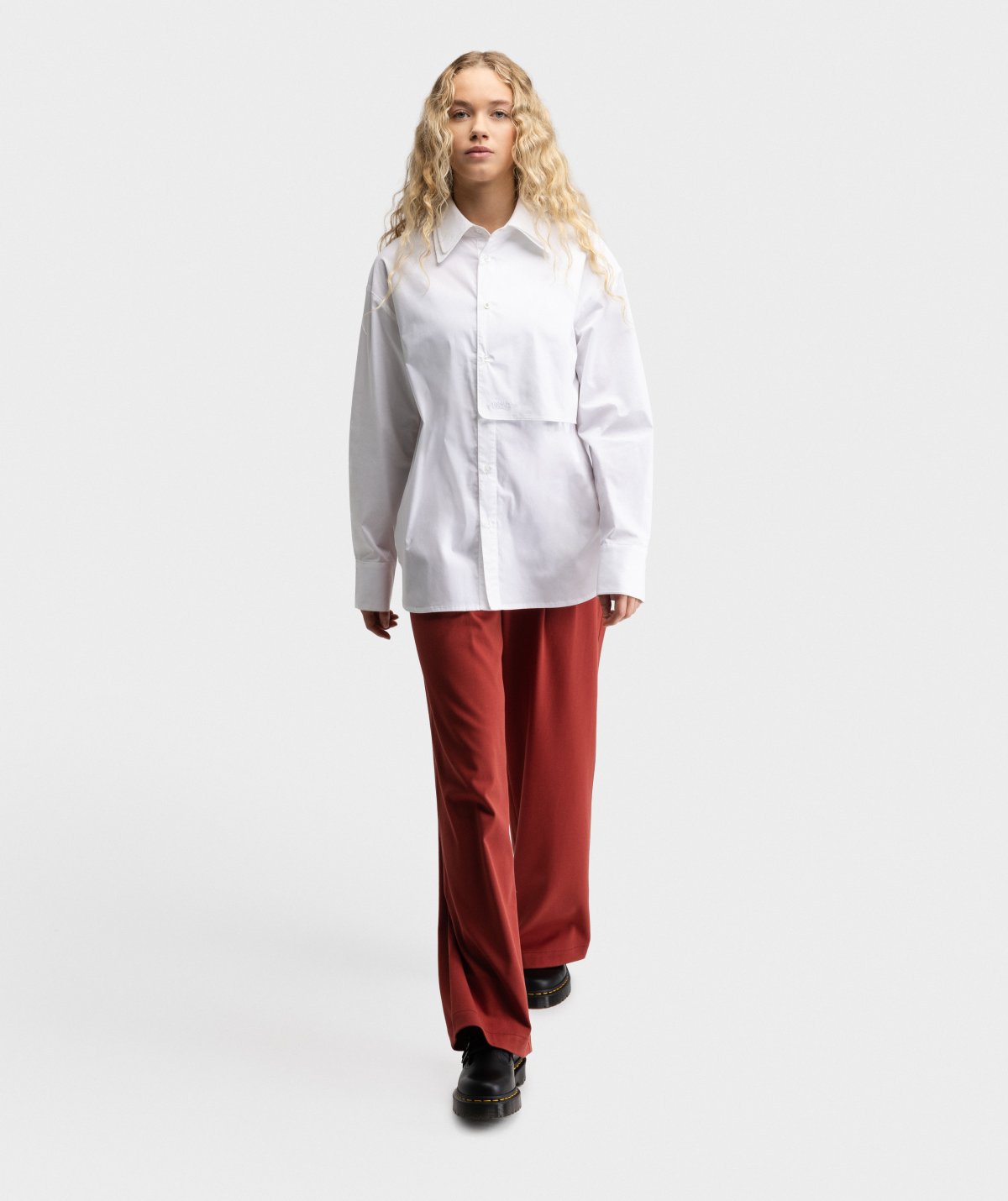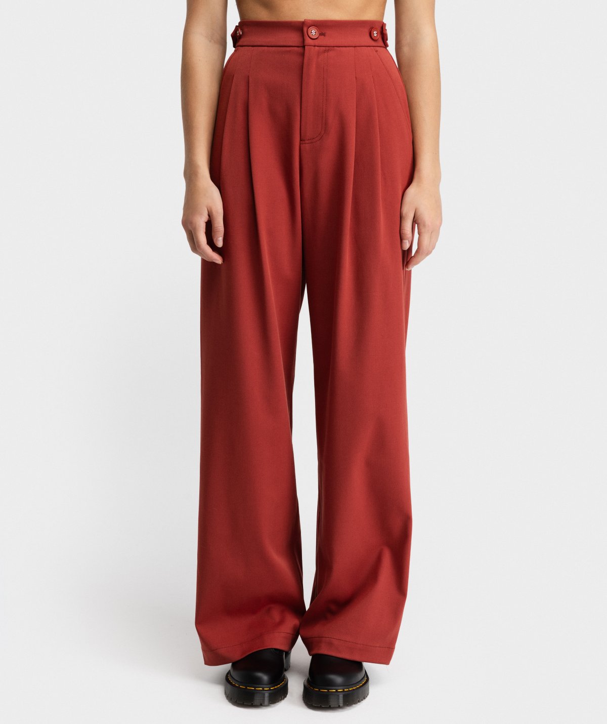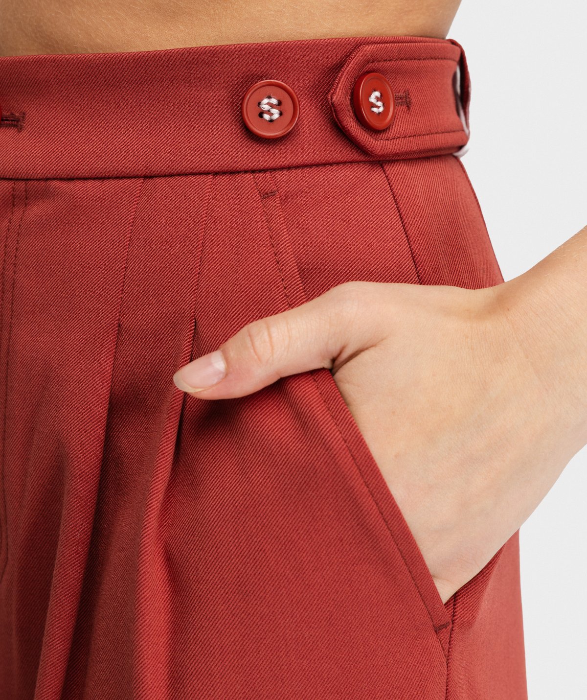 - Cintura subida com aba com botões de diferentes tons para um toque distinto