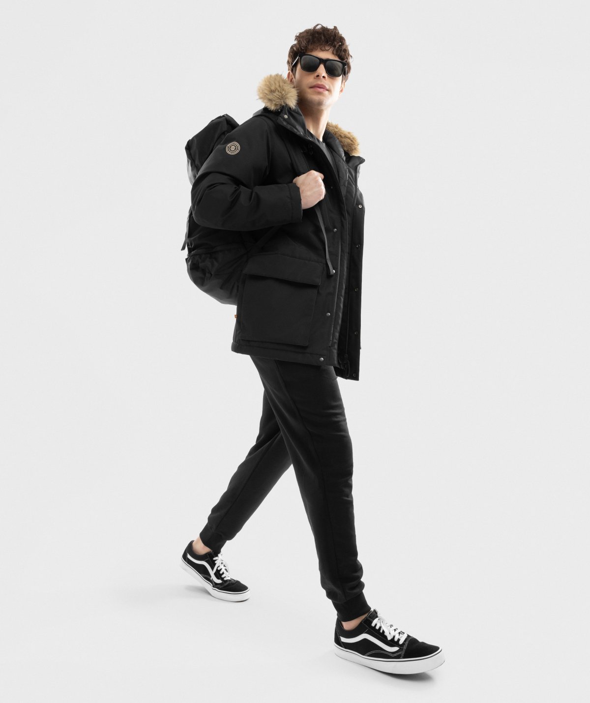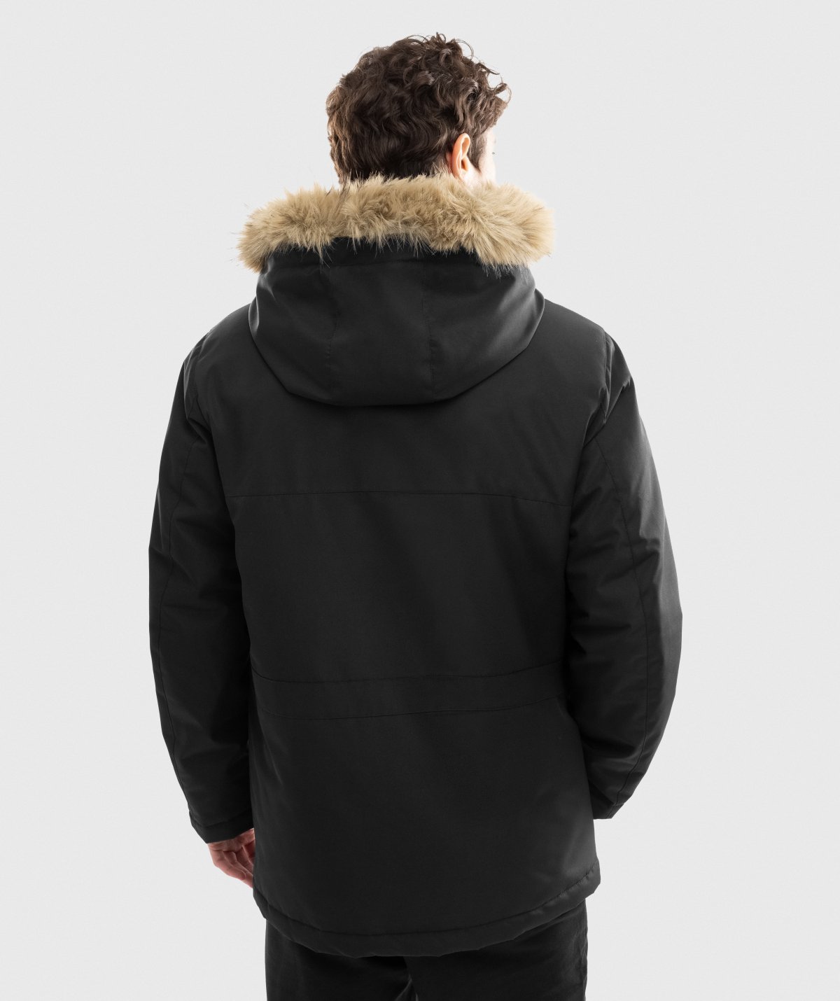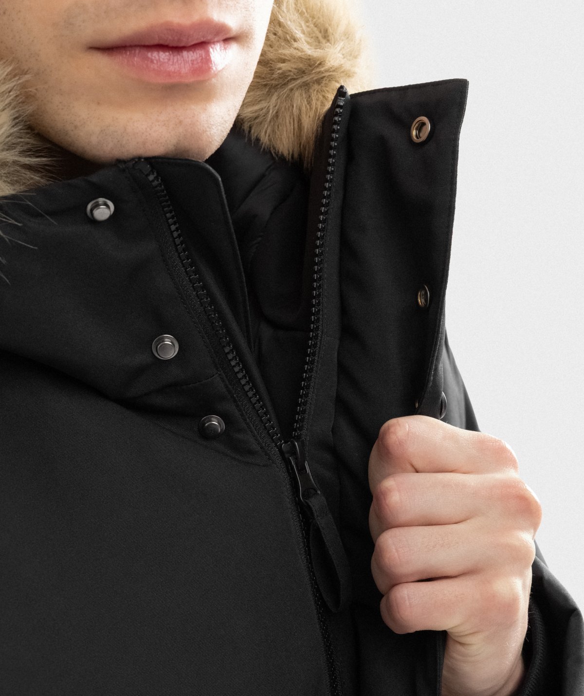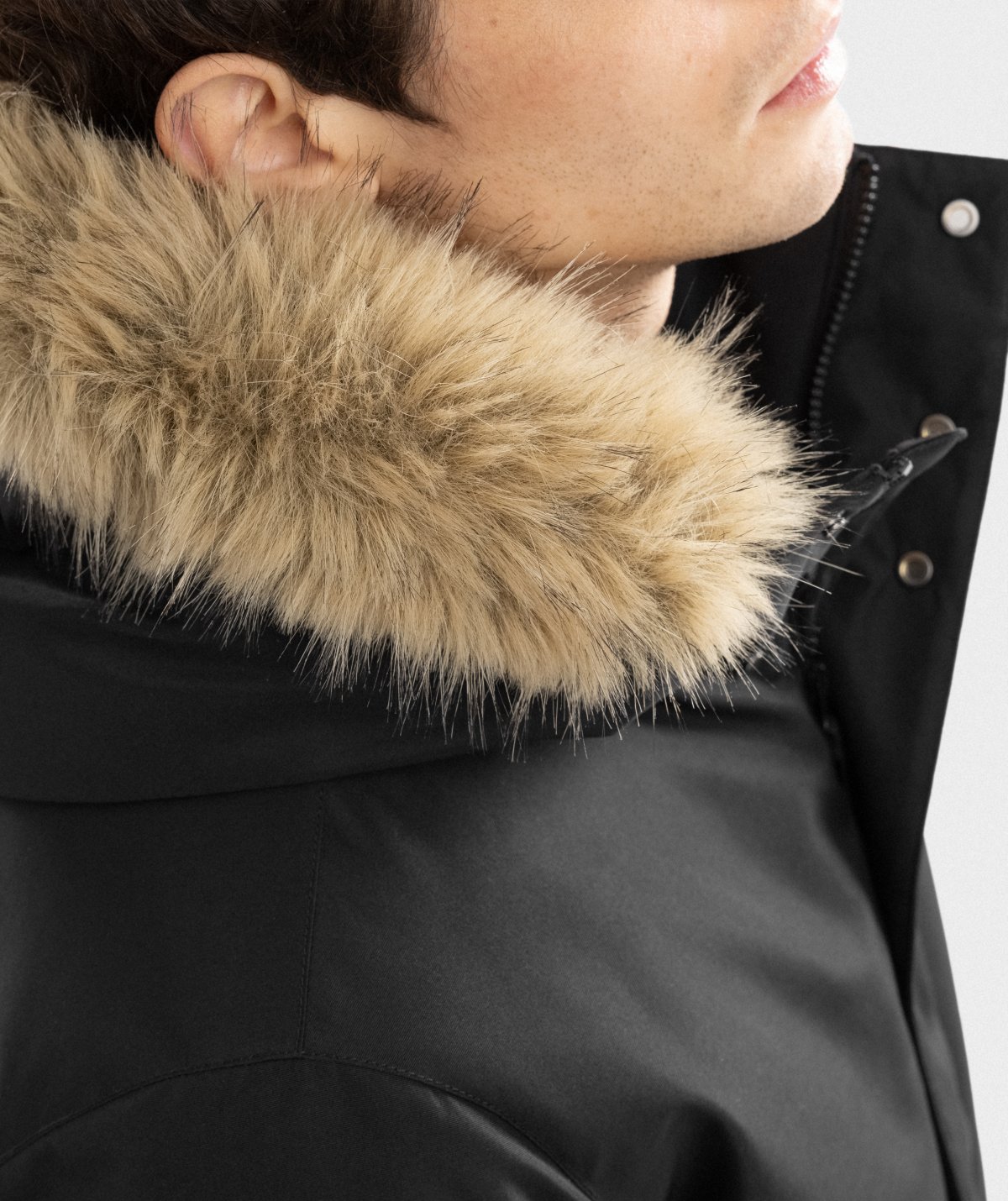 - Capuz ajustável com cordões e rebordo removível de pelo sintético