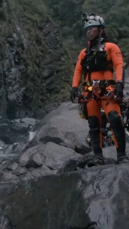 El equipo de barranquismo utiliza la técnica del doble anclaje flotante en el Cañón Malishan en Taiwán · Malishan